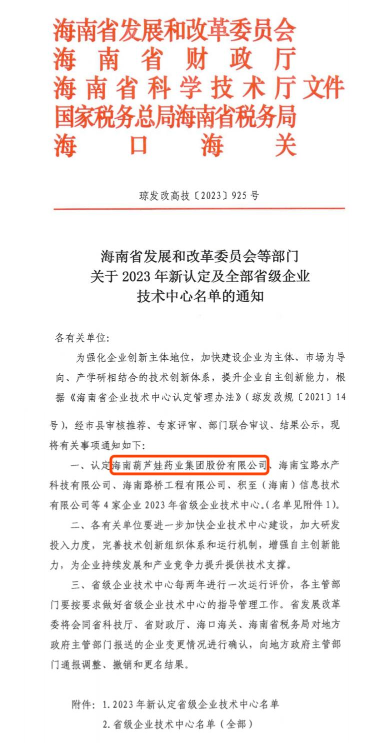 近日,海南省发改委等多部门联合公布了《关于2023年新认定及全部省级企业技术中心名单的通知》,其中,海南BG视讯药业集团股份有限公司成功通过评审,被认定为省级企业技术中心,是本次获批的4家企业之一。
